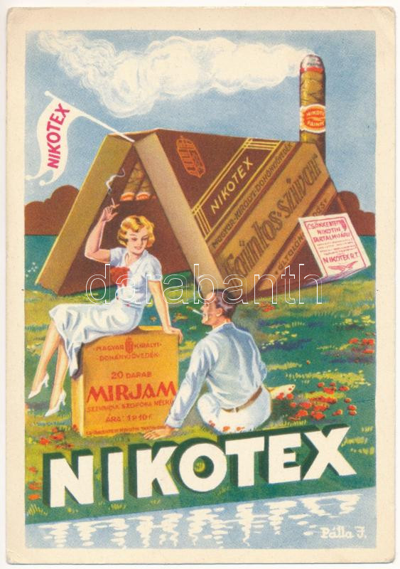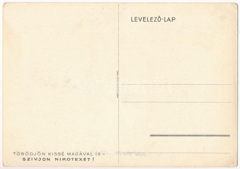 Törődjön kissé magával is - szívjon Nikotexet! Nikotex Faintos cigaretta és szivarka reklámlapja / Hungarian cigarette and cigar advertising card s: Pálla J. (EK)