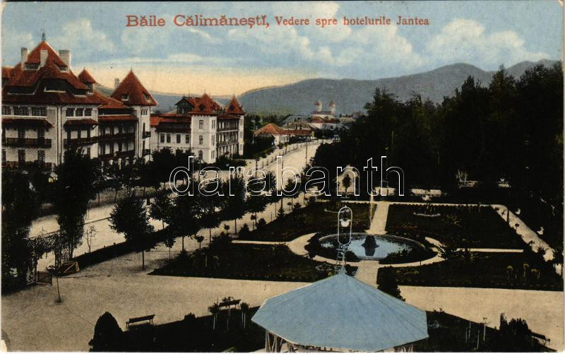 Leírás: 1918 Calimanesti, Baile Calimanesti; Vedere spre hotelurile Jantea / hotels, park. Editura "Galeria de Cadouri" Ad. Maier & D. Stern