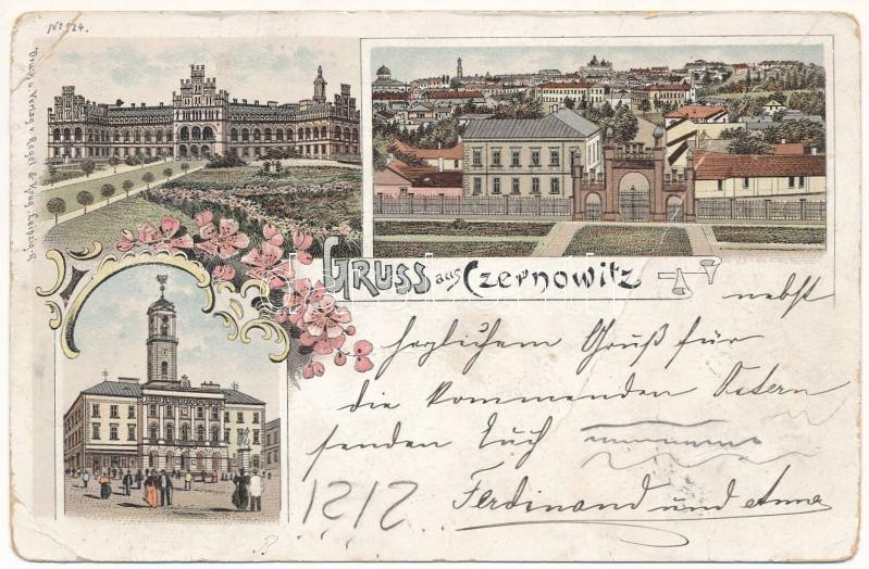 Leírás: 1897 (Vorläufer!) Chernivtsi, Czernowitz, Cernauti, Csernyivci (Bukovina, Bucovina, Bukowina); Orthodox bishop's palace, town hall. Regel & Krug Art Nouveau, floral, litho (fa)