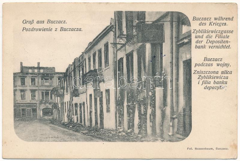 1916 Buchach, Bucsacs, Buczacz; während des Krieges, Zyblikiewiczgasse und die Filiale der Depositenbank vernichtet / WWI destructions, street and bank destroyed, ruins. Fot. Nussenbaum + "K.u.K. Infanterieregiment Nr. 100. Nachrichten-Detachement" (EK)