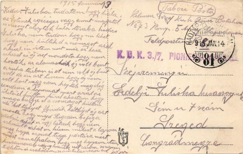 1915 Belcsény, Beocsin, Beocin; Consum Halle, Kantine, Kindergarten, Feuerwehrlokal / áruház, kantin, étterem, óvoda, tűzoltóság / shop, restaurant, canteen, nursery, kindergarten, fire brigade, firefighter department + "K.u.K. 3./7. Pionierkompagnie" "HADTÁP-POSTAHIVATAL 81" + "K.U.K. 3./7. PIONIERKOMPAGNIE" (EK)
