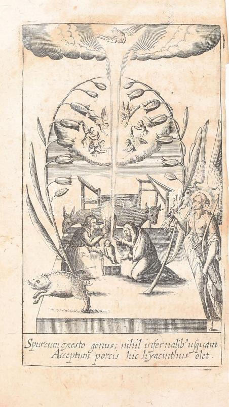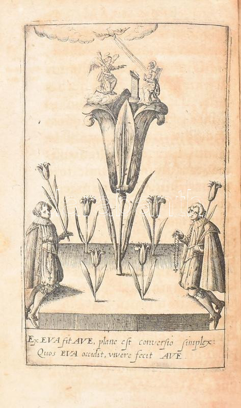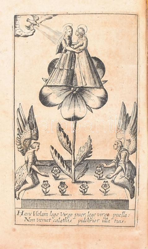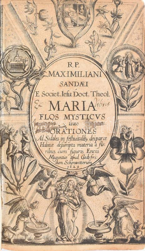 [Maximilian van der Sandt, S.J. (1578-1656)] Maximilian Sandaus: Maria Flos Mysticus sive Orationes ad sodales in festiuitatibus deiparae habitae desumpta materia a floribus cum figuris Eneis. Moguntia [Mainz], 1629, Apud Godefridum Schonwetterum, 381 p.+7 sztl. lev. Oldalszámozáson belül rézmetszetű, díszcímlappal és egészoldalas rézmetszetű illusztrációkkal. Latin nyelven. Korabeli egészpergamen-kötésben, kopott, foltos borítóval, a gerincen apró sérüléssel, possessori bejegyzésekkel az elülső táblán.