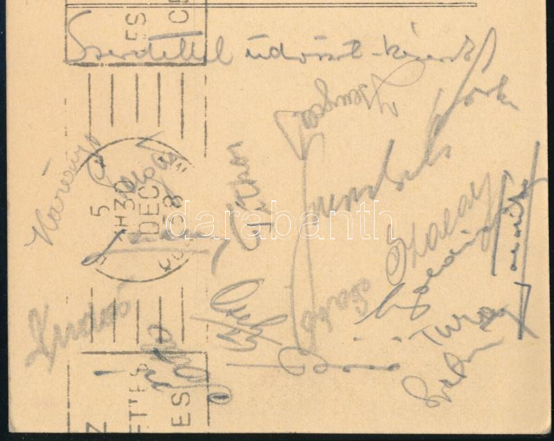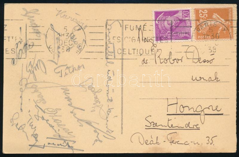 1938 Párizs labdarúgó világbajnokság. A második helyezett magyar csapat által aláírt képeslap Szabó Antal, Polgár Gyula, Bíró Sándor, Szalay Antal, Szűcs György, Lázár Gyula, Sas Ferenc, Zsengellér Gyula, Sárossy György, Vincze Jenő, Titkos Pál, Kohut Vilmos, Háda József, Korányi Lajos, Schaffer. /