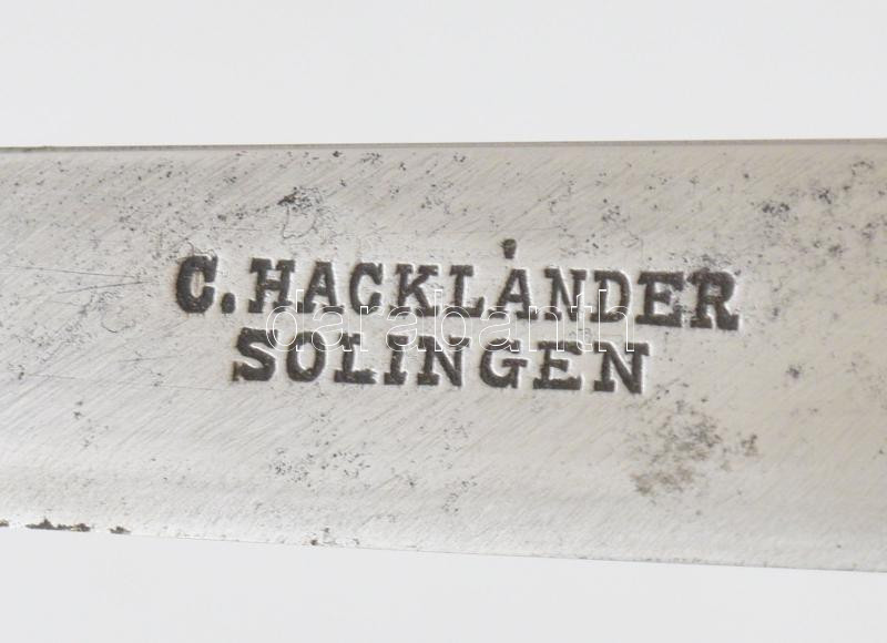 Sétabot vadászjelenettel díszített ezüst (Ag) fogóval. cca 20. sz első fele, pácolt fa, fém véggel, hengerelt ezüst (Ag) fogórésszel, melybe iránytű van ágyazva. A fogón gazdagon megmunkált kacsavadászat jelenete látható, Az iránytű alatt - a bot belsőben - különleges kihúzható és lecsavar- ható ezüstnyelű, solingeni acél pengés, szalonnázókés és csavaros rézfedelű üveg sótartó található, amihez a fogantyú kihúzásával lehet hozzáférni. h: 85 cm 466 / 5 000 Walking stick with a silver (Ag) handle decorated with a hunting scene. circa first half of the 20th century, pickled wood, metal tip, rolled silver (Ag) handle, in which a compass is embedded. The handle shows a richly crafted duck hunting scene. Under the compass - inside the stick - there is a special pull-out and unscrewable silver handle, Solingen steel blade, bacon knife and a glass salt shaker with a screw-on copper lid, which can be accessed by pulling out the handle. h: 85 cm