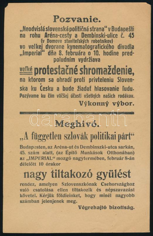 1918 Meghívó a független szlovák politikai párt Szlovákiának Csehországhoz való csatolása ellen tiltakozó gyűlésére (a spanyolnátha miatt elmaradt), kisméretű hirdetmény magyar és szlovák nyelven, 21,5×14 cm / 1918 Summon to a protest against the annexation of Slovakia to the Czech Republic, organized by the independent slovak party (the protest was cancelled due to the Spanish flu), in Hungarian and Slovak, 21,5×14 cm