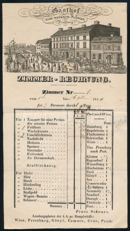 1846 A pozsonyi (Felvidék) Fehér Hattyú vendégfogadó - tulajdonos Franz Schwarz - szobaszámlája, kitöltve, német nyelven a Duna-parti utca fametszetes látképével, jó állapotban