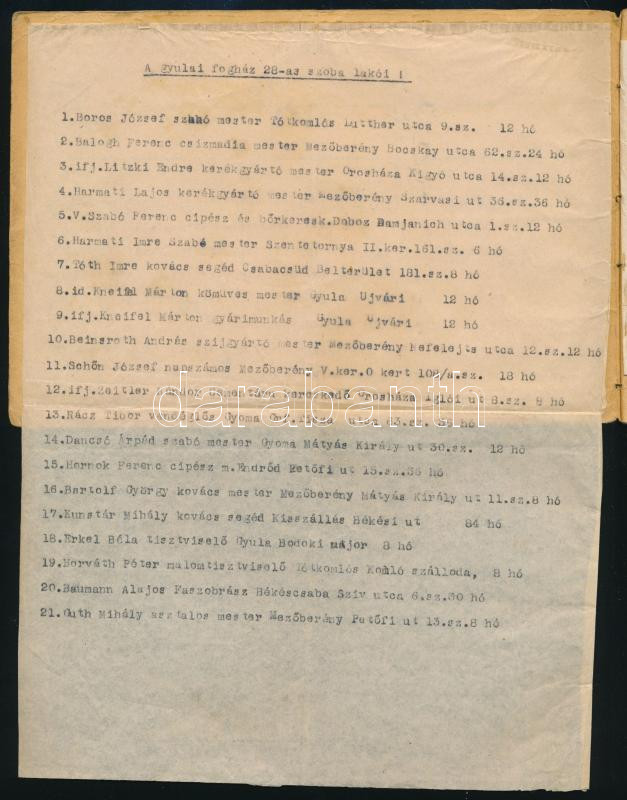 1945 Gyula, egyedi készítésű emlékkönyv: ,,1945. évben a gyulai fogházban politikai büntetésüket töltők emlékkönyve. Baumann Alajos faszobrász." Benne kézzel írt bejegyzésekkel, illetve beragasztott, gépelt dokumentumokkal: a fogház lakóinak listája (név, foglalkozás, lakcím megadásával), kézzel írt kotta (,,Haza vágyom" c. dal), stb. Harántalakú papírkötésben, kissé viseltes, koszos borítóval.