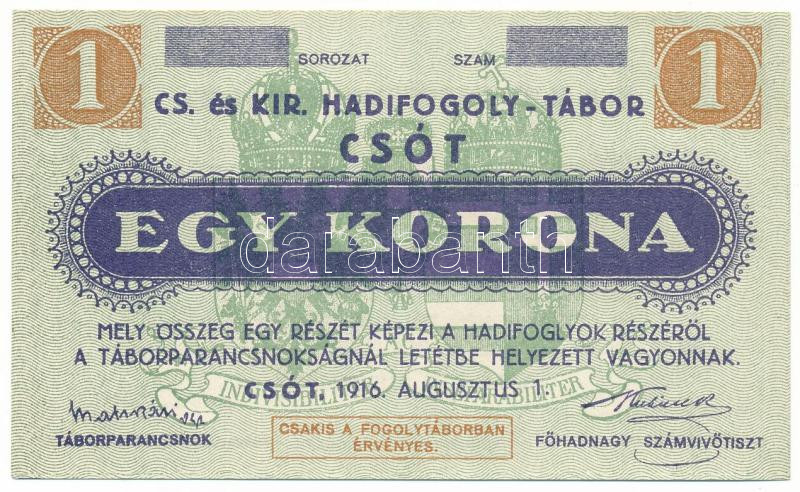 Csót / Hadifogolytábor 1916. augusztus 1. 1K sor- és sorozatszám nélkül T:AU / Hungary / Csót / POW Camp August 1st, 1916. 1 Korona without series and serial number C:AU