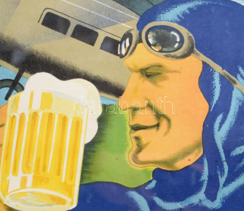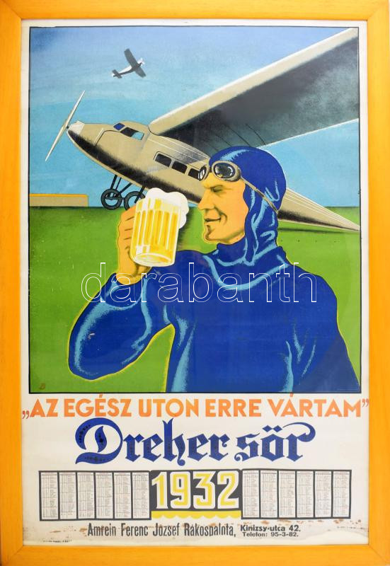 1932 "Egész úton erre vártam" Dreher sör plakát és falinaptár, Amrein Ferenc József, Rákospalota, Kinizsy u. 42, kiadja: Frick József, jelzett (B), javított, lap széle kissé foltos, plexiüvegezett fakeretben, 94×63 cm. KIZÁRÓLAG SZEMÉLYES ÁTVÉTEL, NEM POSTÁZZUK! / ONLY PERSONAL COLLECTION AT OUR OFFICE!