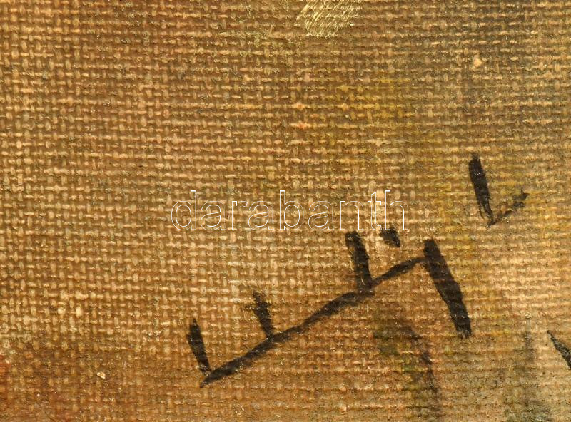 Leírás: Olvashatatlan jelzéssel: Tavi tájkép. Olaj, vászon. Kissé sérült dekoratív fakeretben. Kissé hullámos, 25x35 cm