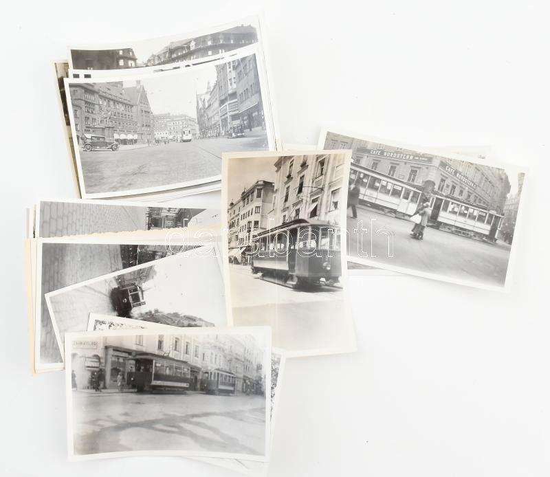Leírás: 1932-1938 18 db fénykép különböző európai városokról, rajtuk villamosok, 6,5×10 cm