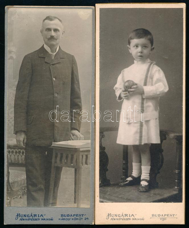 Leírás: cca 1910 Férfi és gyermek portréja, keményhátú fotó a budapesti Hungária műteremből, 11,5×5 cm
