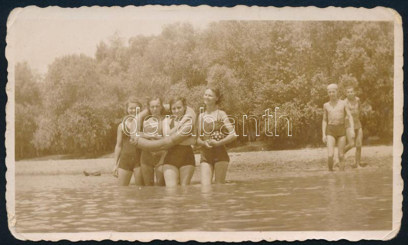 cca 1940 Fürdőző lányok és őket bámuló fiúk, fotó, 6,5x11 cm https://www.darabanth.com/hu/440-Gyorsarveres/440.0/Fotomuveszet/Foto~500023/cca-1940-Furdozo-lanyok-es-oket-bamulo-fiuk-foto-6-5x11-cm~II2893198