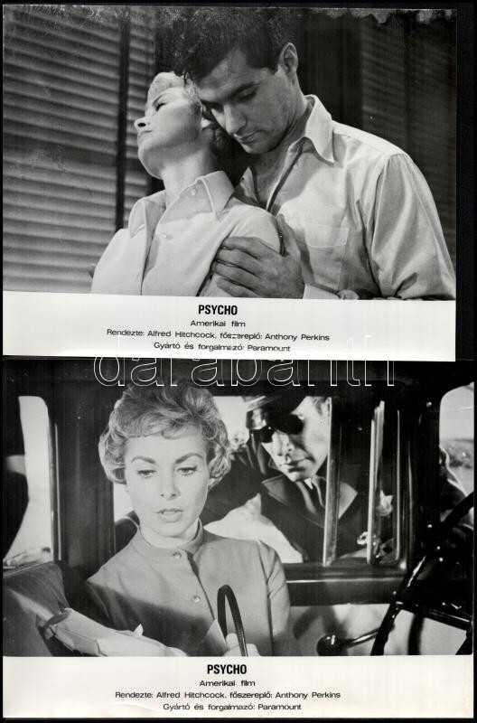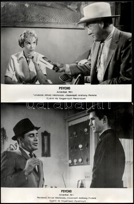 cca 1960 Alfred Hitchcock ,,Psycho" című amerikai filmjének jelenetei és szereplői, 19 db vintage produkciós filmfotó, ezüst zselatinos fotópapíron, a képek többsége hibás (kopásfoltok, elszíneződés, törésvonal, stb.), 18x21 cm