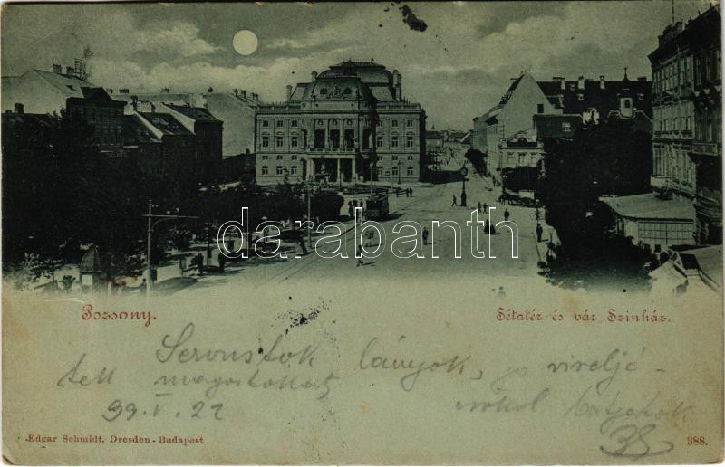 Leírás: 1899 (Vorläufer) Pozsony, Pressburg, Bratislava; Sétatér, vár, színház, este, villamos / promenade, castle, theatre, night, tram (EK) + "POZSONY P.U."