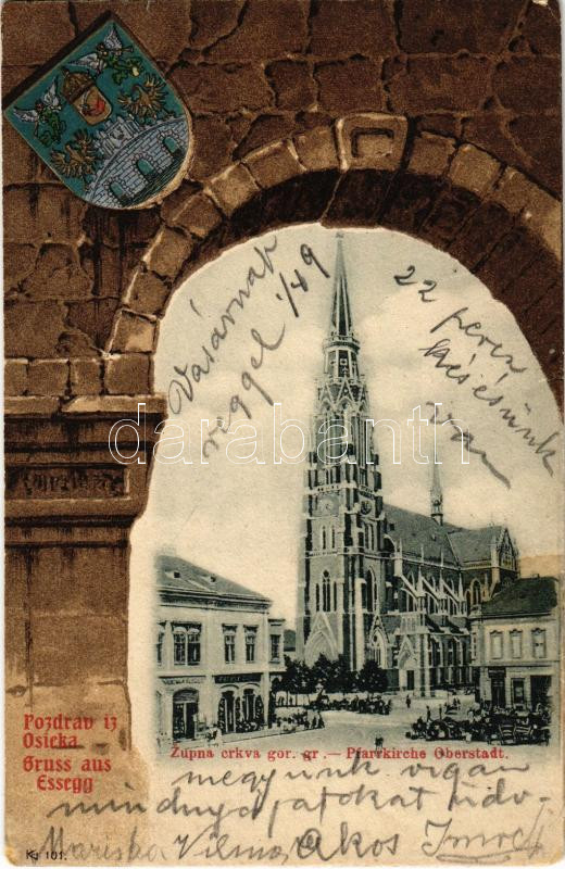 1901 Eszék, Osijek, Essegg; Zupna crkva gor. gr. Pfarrkirche Oberstadt. Victor Fritsche / Felsővárosi Plébániatemplom. Címeres szecessziós litho keret / church, market. Art Nouveau coat of arms litho (kis szakadás / small tear)