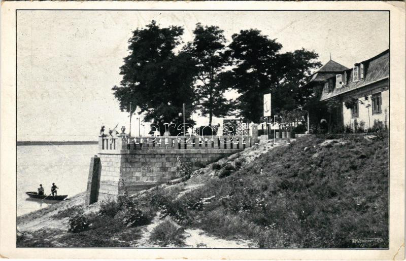 Leírás: Budapest XXII. Budafok, Schindele Macskacsárda éttermei a Duna-parton, evezős csónak (EK)