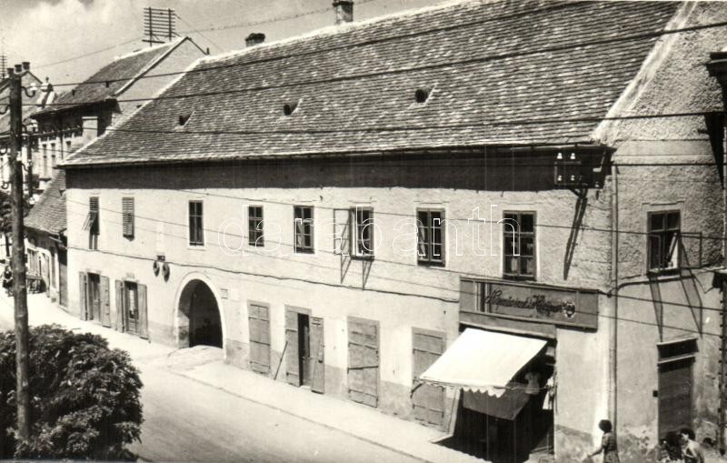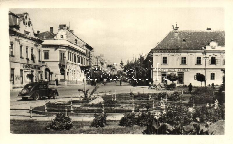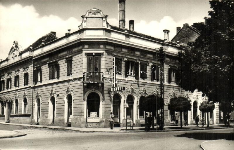 Keszthely - 8 db modern városképes lap: Kossuth Lajos utca, Tanácsház, Goldmark Károly szülőháza, Kórház, Hungária szálló és étterem, Gyógyszertár, automobil, Halászcsárda
