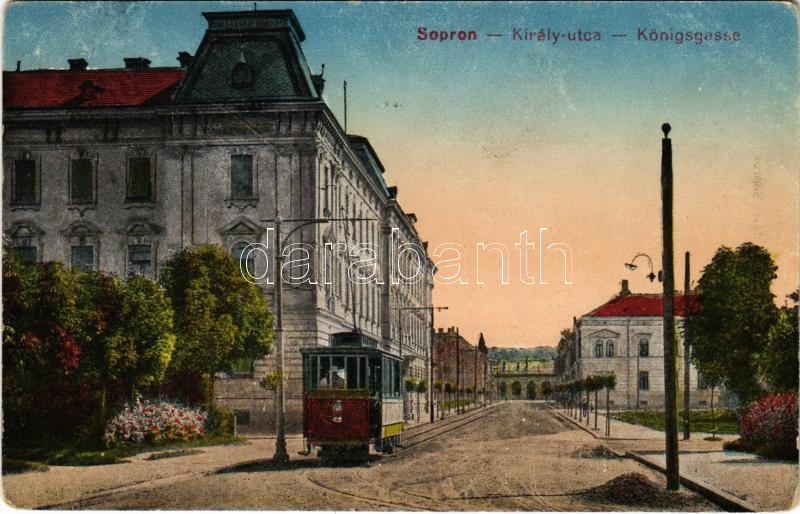 Sopron, Király utca, villamos. Kiadja Blum Náthán és Fia (Rb) https://www.darabanth.com/hu/440-Gyorsarveres/440.0/Kepeslapok/Magyarorszag~2000005/Sopron-Kiraly-utca-villamos-Kiadja-Blum-Nathan-es-Fia-Rb~II2889192