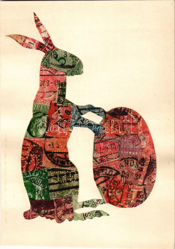 Leírás: Húsvéti nyuszi tojással. Bélyegekből kivágott és összeragasztott üdvözlő képeslap. Budai nyomda / Easter bunny and egg. Greetings made out of stamps