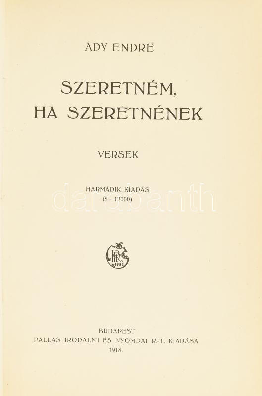 Ady Endre: Szeretném, ha szeretnének. Versek. Bp., 1918., Pallas, 134+... https://www.darabanth.com/hu/440-Gyorsarveres/440.0/Konyvek/Konyvek-Egyeb-ritkasagok~500056/Ady-Endre-Szeretnem-ha-szeretnenek-Versek-Bp-1918-Pallas-134plus2p-Harmadik-kiadas-Atko~II2893593