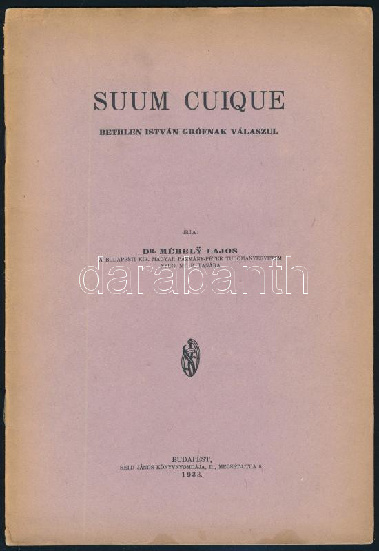 Méhely Lajos: Suum Cuique. Bethlen István grófnak válaszul. Bp., 1933.... https://www.darabanth.com/hu/440-Gyorsarveres/440.0/Konyvek/Konyvek-Egyeb-ritkasagok~500056/Mehely-Lajos-Suum-Cuique-Bethlen-Istvan-grofnak-valaszul-Bp-1933-Held-Janos-13-p-KiadC3~II2888539