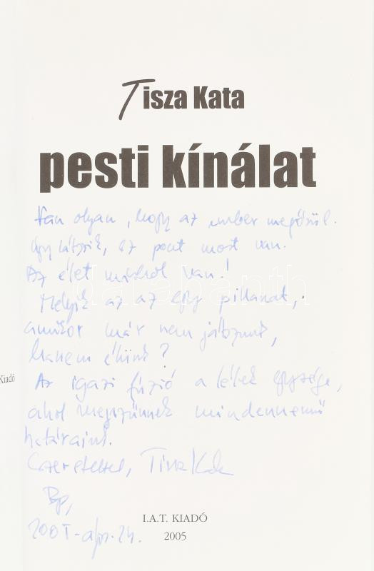 Tisza Kata: Pesti kínálat. DEDIKÁLT! Bp., 2005., I.A.T. Kiadói papírkö... https://www.darabanth.com/hu/440-Gyorsarveres/440.0/Konyvek/Konyvek-Egyeb-ritkasagok~500056/Tisza-Kata-Pesti-kinalat-DEDIKALT-Bp-2005-IAT-Kiadoi-papirkotes~II2892677
