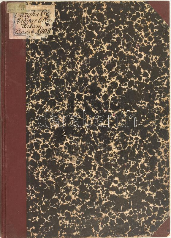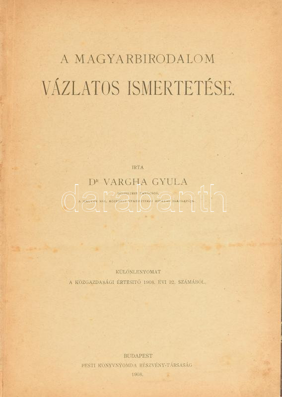 Vargha Gyula: A Magyarbirodalom vázlatos ismertetése. Különlenyomat a Közgazdasági Értesítő 1908. évi 32. számából. Hozzákötve: Vargha, Julius: Die Wirtschaftlichen und Kulturellen Verhältnisse Ungarns. Separatabdruck. Bp., 1908., Pesti Könyvnyomda Rt., 55+75 p. Magyar és német nyelven. Átkötött félvászon-kötésben, az első mű bekötött elülső borítóval, ceruzás bejegyzésekkel.