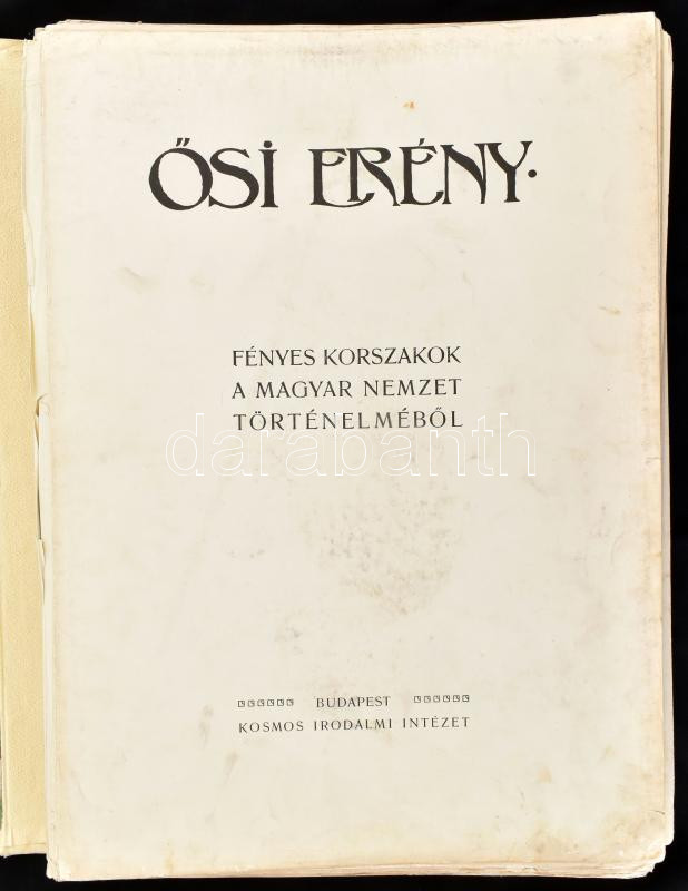 Ősi Erény - Fényes korszakok a magyar nemzet történelméből. Ötven darab fénymetszettel melyeket híres hazai festők képei tesznek ki: Than Mór, Vágó Pál, Kovács Mihály, Munkácsy Mihály, Lotz Károly, Benczúr Gyula, Pálya Celesztin, Weber Ferenc, Lietzenmayer Sándor, Grünwald Béla, Orlay Soma, Molnár József, Matejkó Sándor, Bihari Sándor, Székely Bertalan, Tornay Gyula, Gyárfás Jenő, Madarász Viktor, Koroknyai Ottó, Kriesch Aladár, Dudits Andor, Holló Barnabás, Zichy Mihály, Pataky László. Bp.,é.n., Kosmos. Kiadói egészvászon kötésben, hiányos: címlapot és tartalomjegyzéket leszámítva csak heliogravűrök!, valamint 3 tábla hiánnyal, rossz, széteső állapotban, kopott, foltos borítóval, néhány lapon kis szakadásokkal.