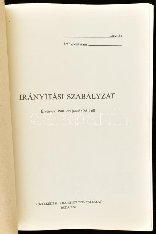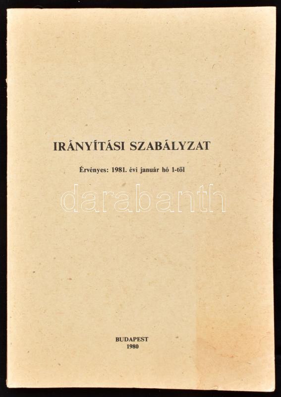 Irányítási szabályzat. (Érvényes: 1981. évi január hó 1-től). Bp., 1980, KPM Vasúti Főosztály MÁV Vezérigazgatóság - KÖZDOK. Kiadói papírkötés, a borító sarkán kisebb folttal. Megjelent 3070 példányban.