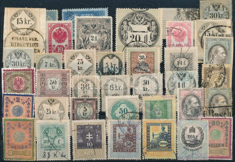 Leírás: 38 db régi magyar, osztrák, bosnyák okmánybélyeg