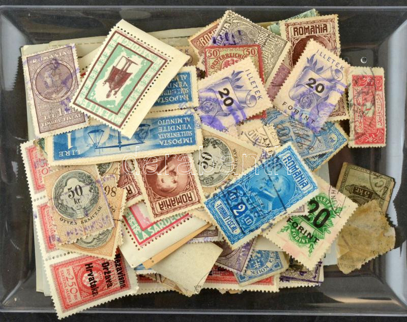 Leírás: Vegyes külföldi 100-200 okmánybélyeg, levélzáró csokis dobozban