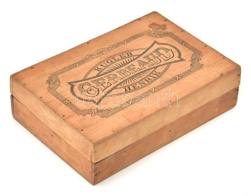 Leírás: Kugler Gerbeaud Henrik fadoboz, foltos, az alján repedéssel, kis lepattanással, 19x13x5 cm