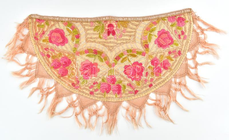 Leírás: Mezőkövesdi terítő, gazdagon hímzett virágmintás díszítés, apró hibákkal, 20. sz. első fele, h: 55, sz: 27 cm