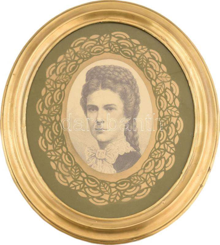 Leírás: Ovális, üvegezett, rézlemez borítású fa képkeret, apró kopásnyomokkal, modern Erzsébet királyné (Sisi) nyomattal, látható méret: 32x26,8 cm