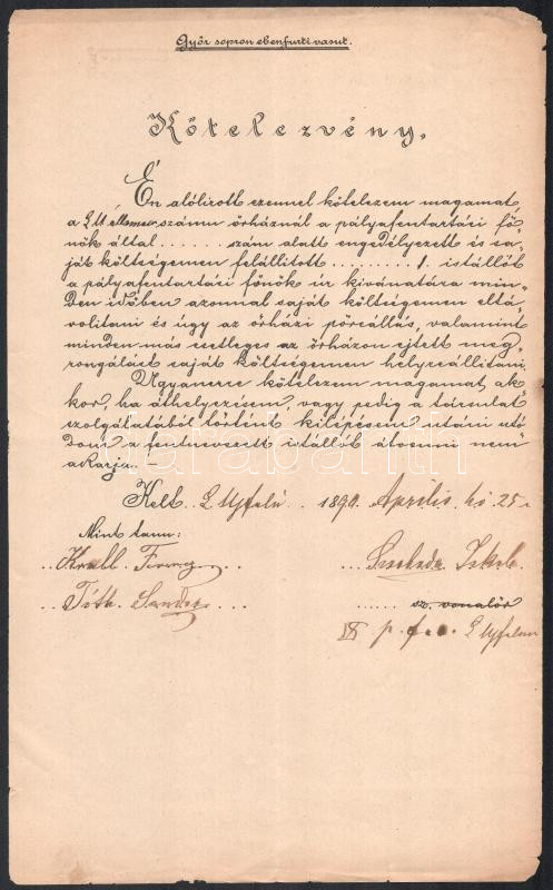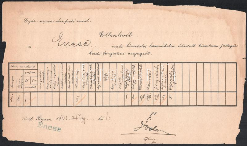 1890-1914 GYSEV vétlevél az üzletigazgatóságtól átvett bizalmas jellegű hadiforgalmi anyagról, 2 db okmány 1914. VIII.1 és 2. dátummal, az I. világháború kezdeti idejéből, Lajtaújfalu + 1890 GYSEV kötelezvény örháznál végzendő szolgálatról + 1 db egyéb okmány
