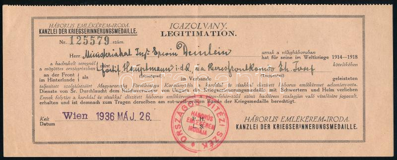 Leírás: 1936 Háborús emlékérem viselési igazolvány