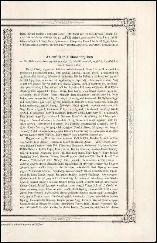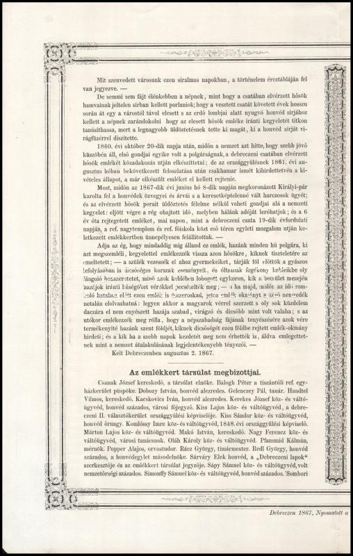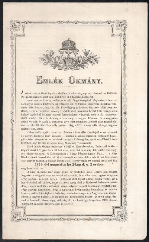 Leírás: 1867 Debrecen, emlékokmány az 1849-es hadjárat során elszenvedett sanyargatások okán