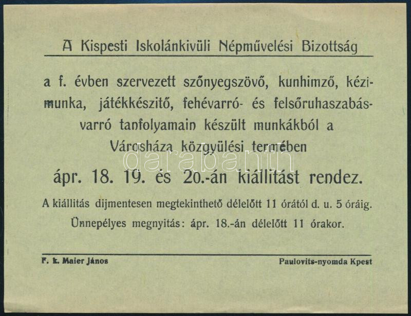 Leírás: cca 1930 A Kispesti Iskolánkívüli Népművelési Bizottság kiállításáról szóló szórólap