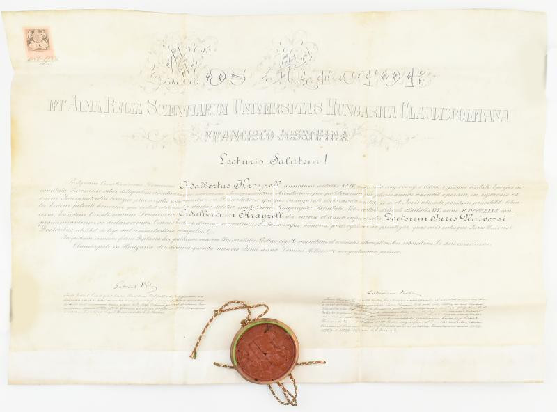 Leírás: 1901 Jogi diploma a Kolozsvári Tudományegyetemről. Pergamen, sérült függő viaszpecséttel, fedél nélkül Krayzell Adalbert részére