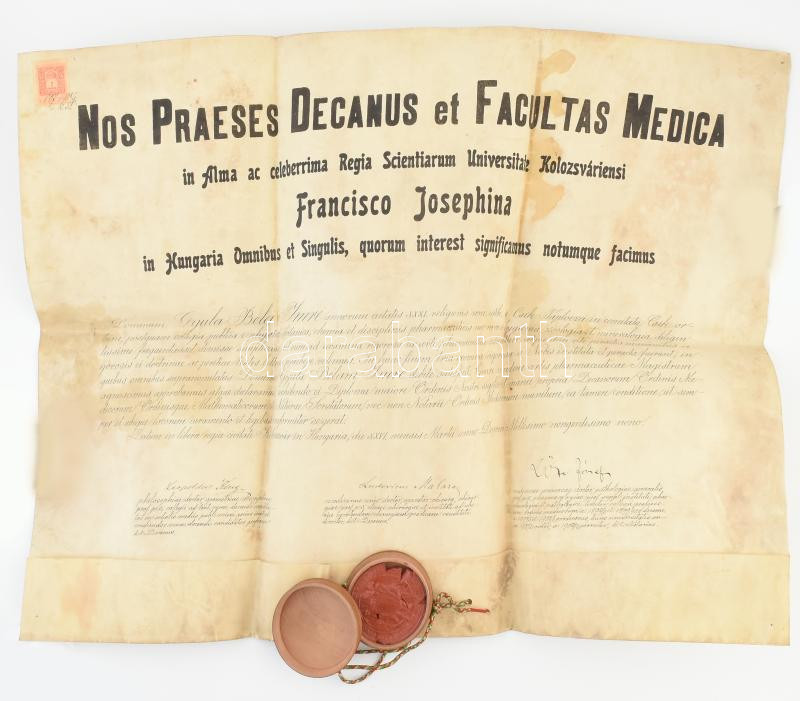 1909 Orvosi diploma a Kolozsvári Tudományegyetemről a csíktapolcai Gyu... https://www.darabanth.com/hu/440-Gyorsarveres/440.0/Mutargy-papirregiseg-egyeb/Okmanyok~500020/1909-Orvosi-diploma-a-Kolozsvari-Tudomanyegyetemrol-a-csiktapolcai-Gyula-Bela-Imre-reszere-P~II2894799