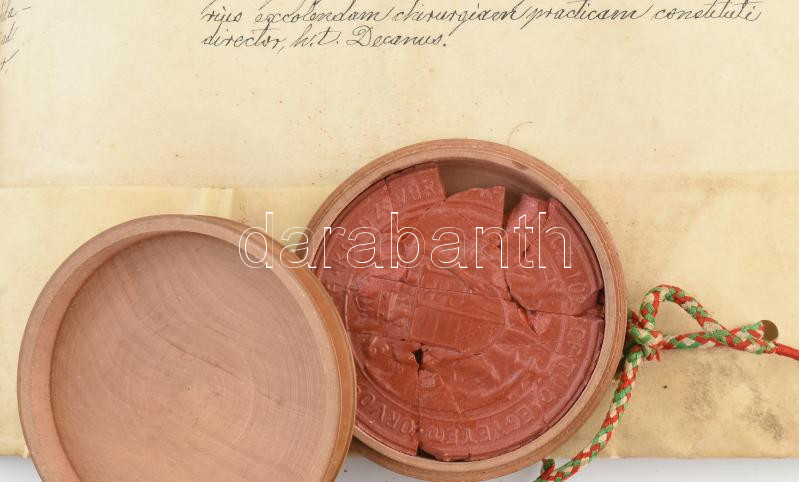 Leírás: 1909 Orvosi diploma a Kolozsvári Tudományegyetemről a csíktapolcai Gyula Béla Imre részére. Pergamen sérült viaszpecséttel