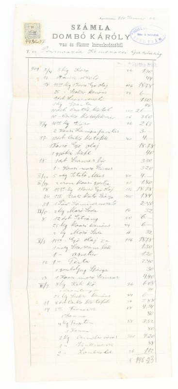 Leírás: 1910 Ipolyság, számla Dombó Károly vas és fűszerkereskedéséből, okmánybélyeggel