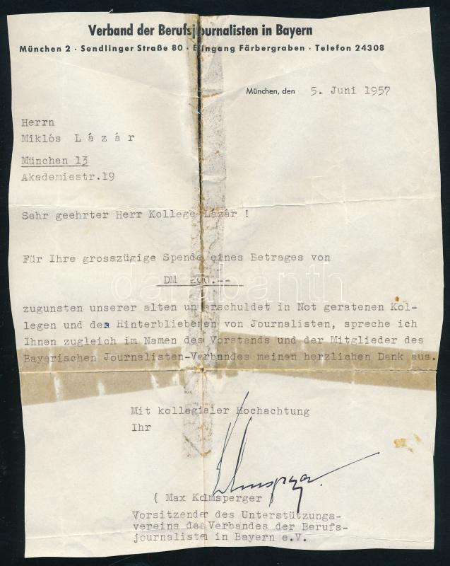 1957 Max Kolmsperger (1890-1966) német újságíró levele Lázár Miklósnak https://www.darabanth.com/hu/440-Gyorsarveres/440.0/Mutargy-papirregiseg-egyeb/Okmanyok~500020/1957-Max-Kolmsperger-1890-1966-nemet-ujsagiro-levele-Lazar-Miklosnak~II2894555