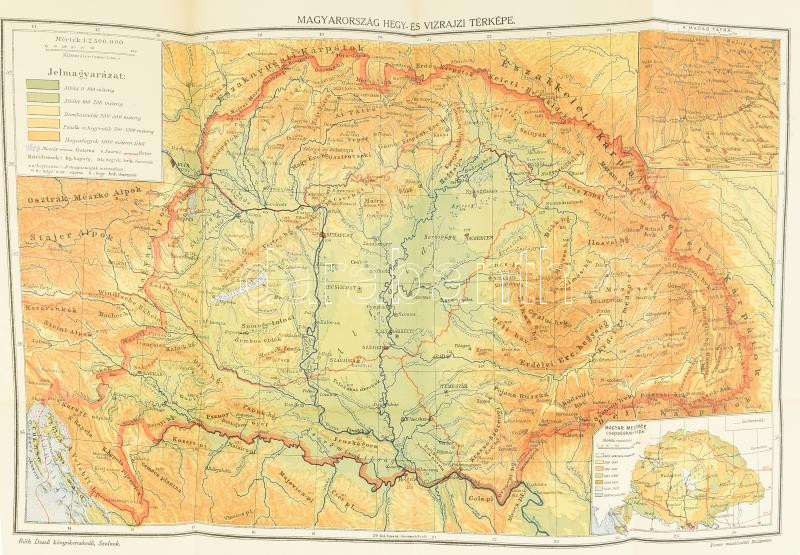 Leírás: cca 1910 Magyarország hegy- és vízrajzi térképe, 1 : 2.500.000, Szolnok, Róth Dezső (Bp., Posner-ny.), 45,5x30 cm