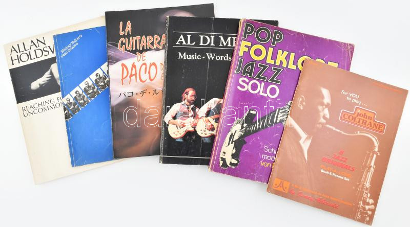 cca 1970-1990 6 db zenei kiadvány kottákkal, főleg jazz, közte: Allan Holdsworth, John Coltrane, Pop Folklore Jazz Solo, Al di Meola, Paco de Lucia, Mickey Baker's Jazz Gitarre, angol ill. német nyelven, vegyes állapotban