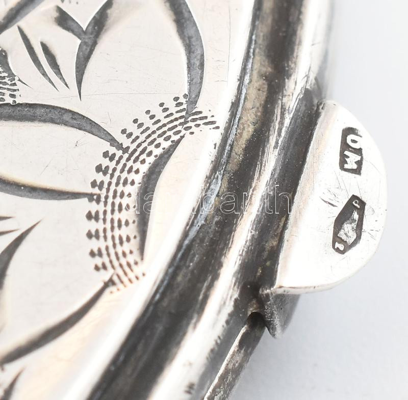 Leírás: Ezüst (Ag) pudrié, vésett, jelzett, d: 8 cm, nettó: 46g