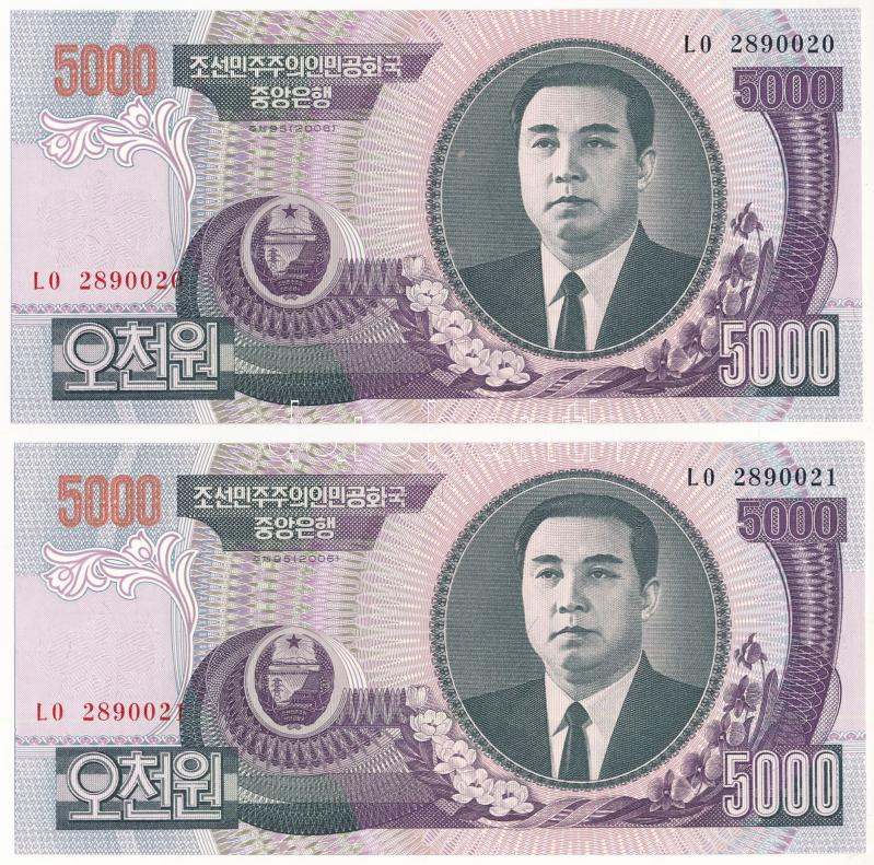 North Korea 2006. 5000 Won (2x) consecutive serials "L0 2890020 - L0 2890021"C:UNC