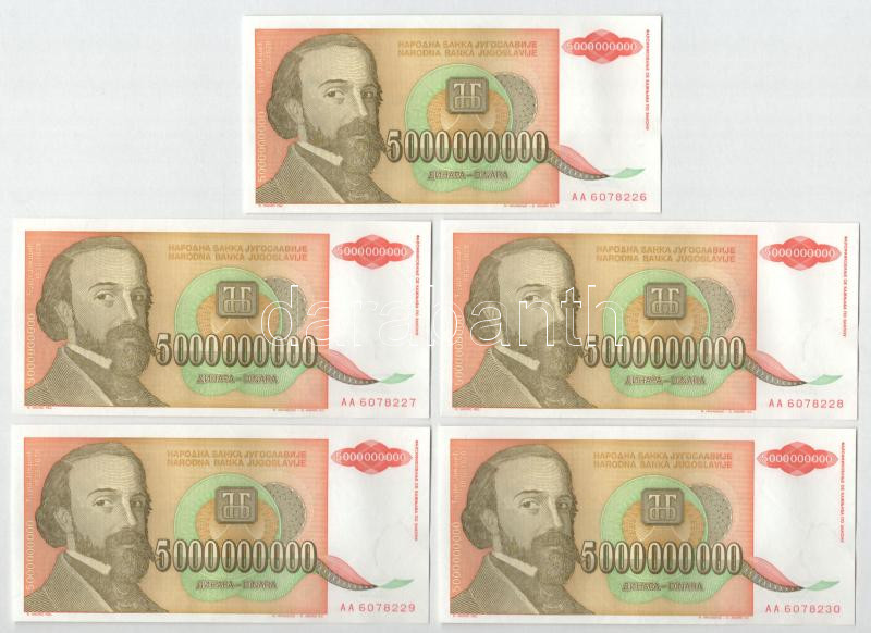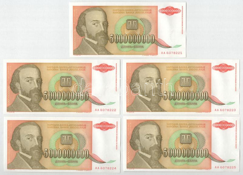 Leírás: Jugoszlávia 1993. 5.000.000.000D (10x) sorszámkövetők "AA 6078221 - AA 6078230" T:AU halvány vízfolt, hullámos papír