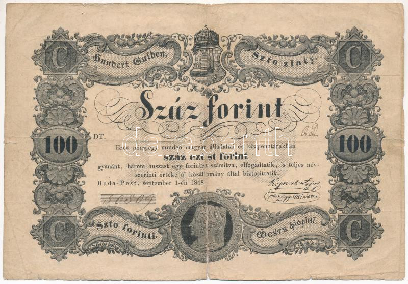Leírás: 1848. 100Ft "Kossuth bankó", "DT 50509" T:VG folt, szakadások /
